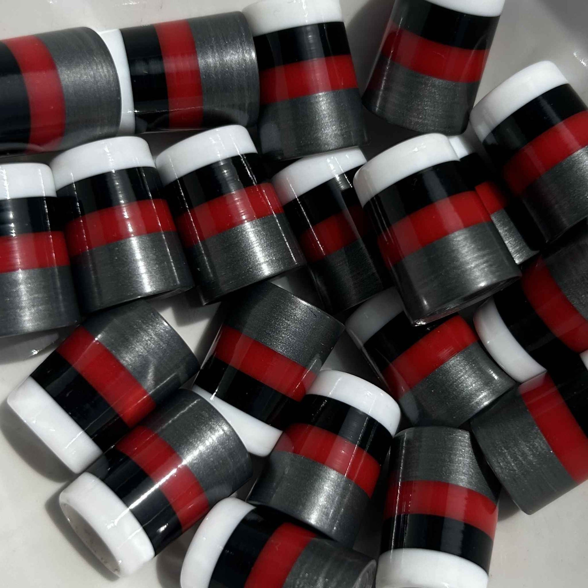 Color-blocked in silver, red, black, and white, these shorty custom golf ferrules are just 3/4" but pack big style. Albatross Ferrules are designed to fit .355" taper tip shafts. For .370" shafts, a light ream is recommended for a smooth, secure fit. Easily re-polished with acetone after sanding.